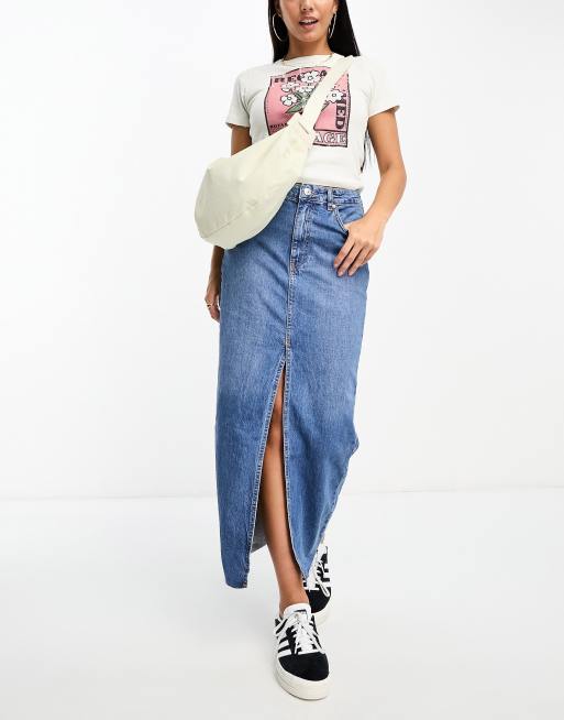 Stradivarius denim midi skirt with front split in midwash blue ASOS Very well made.