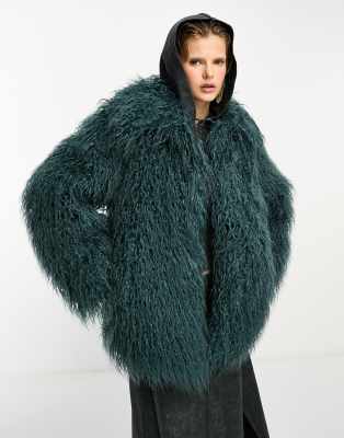 COLLUSION shaggy faux mongolian fur jacket in blue Grey Very well made.