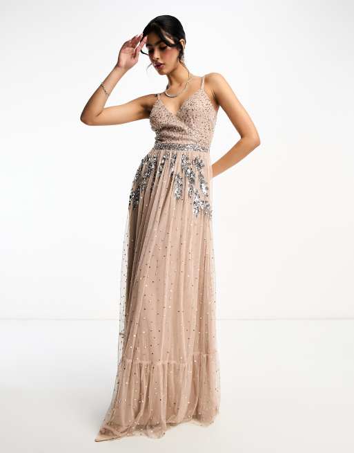 Maya Bridesmaid wrap front maxi tulle dress with tonal delicate sequin in taupe blush co ord Very well made.