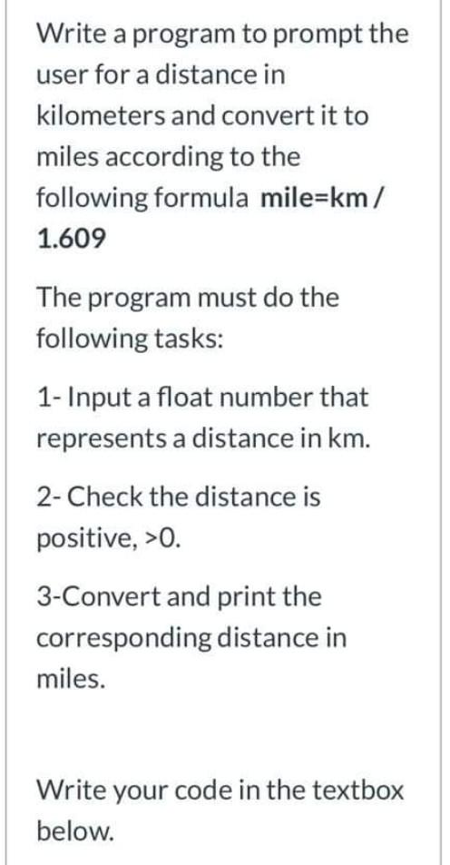 Solved Write a program to prompt the user for a distance in Very well made.
