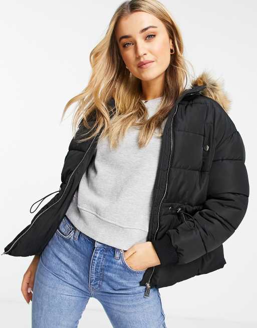 Miss Selfridge cord waisted puffer jacket with fur hood in black Very well made.