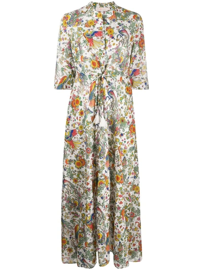 Tory Burch Peacock Flora Printed Cotton Shirt Dress In White Very well made.