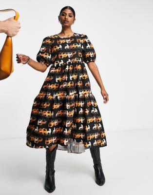 Vila short sleeve midi high low dress with tiered skirt in black print Very well made.