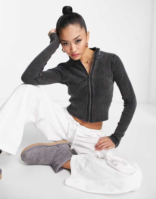 Pull Bear zip front ribbed top in washed black Very well made.