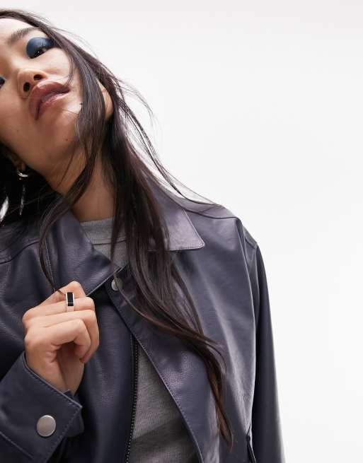 Topshop faux leather oversized pocket collar bomber jacket in blue Very well made.