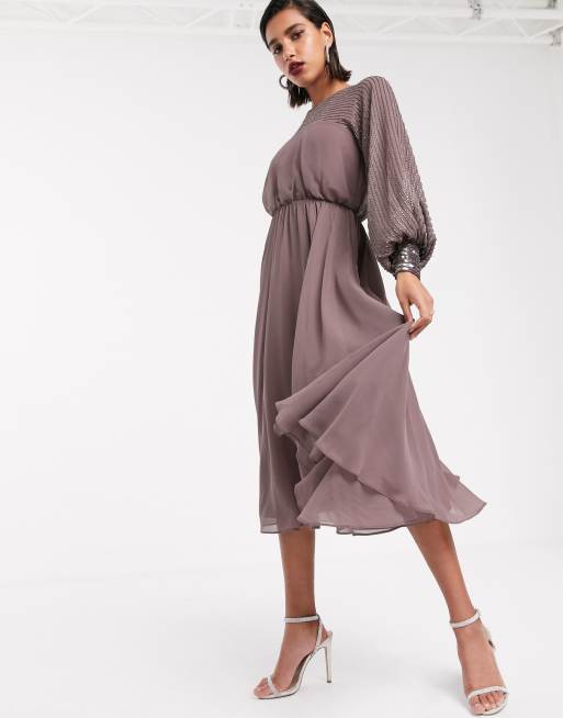 ASOS DESIGN midi dress with linear yoke embellishment in mauve Very well made.