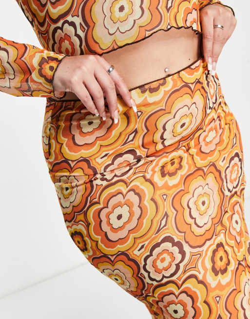 Neon Rose Plus midi skirt with lettuce hem in 70s floral mesh co Very well made.